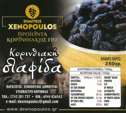 Η μαύρη Κορινθιακή σταφίδα είναι από τα αγνότερα  αγροτικά προϊόντα αφού για την παραγωγή της πραγματοποιούμε ελάχιστες παρεμβάσεις . Δίκαια θεωρείται «υπερτροφή»  (superfood)  αφού πολλές σύγχρονες διεθνείς μελέτες αποδεικνύουν τα  πολλά οφέλη για τον ανθρώπινο οργανισμό από τη  κατανάλωση της . 250gr
