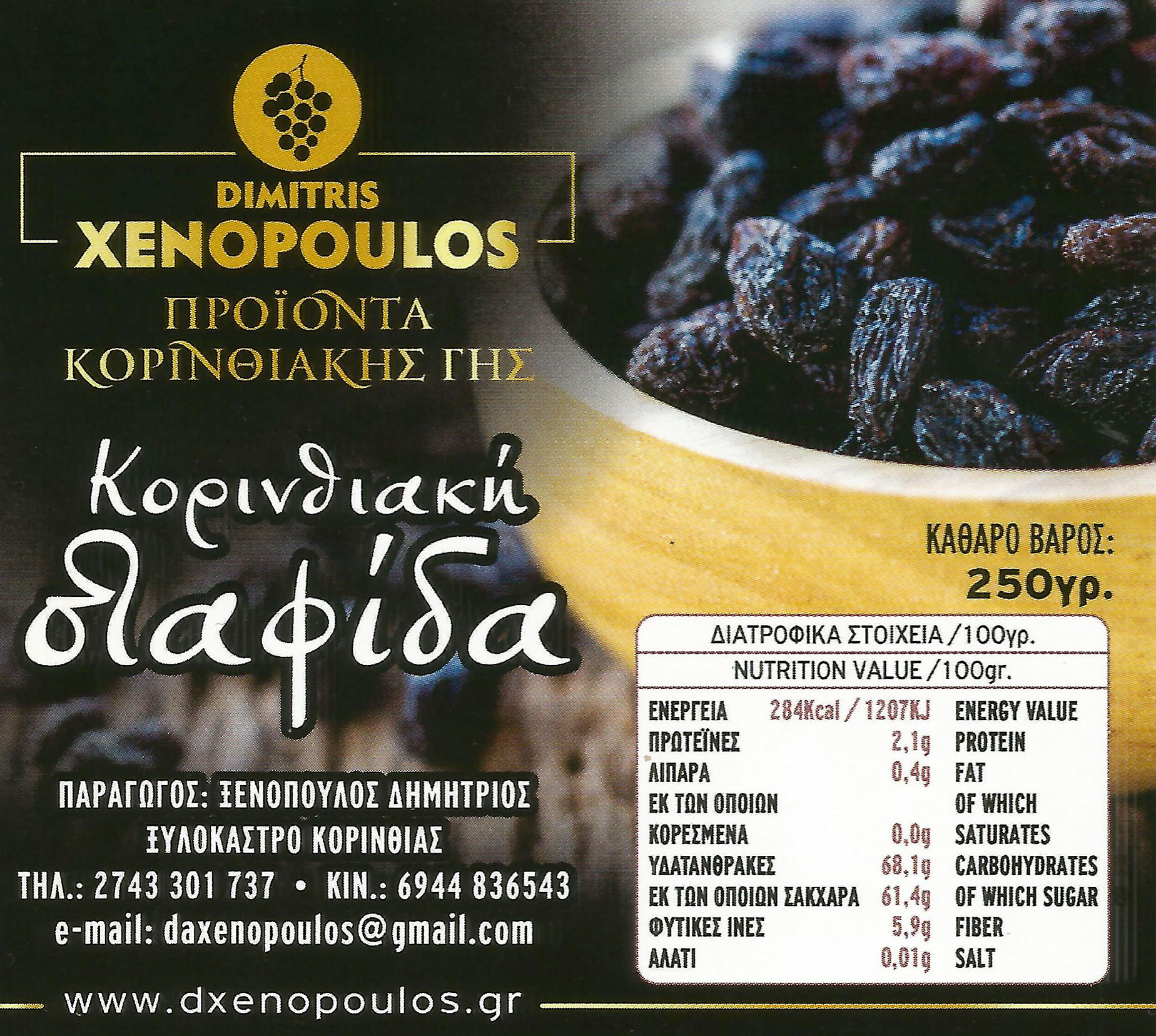 Παράγω  και τυποποιώ μαύρη Κορινθιακή ξηρή σταφίδα σε μικρές και μεγάλες συσκευασίες  και διαθέτω  τα απαιτούμενα πιστοποιητικά επεξεργασίας .